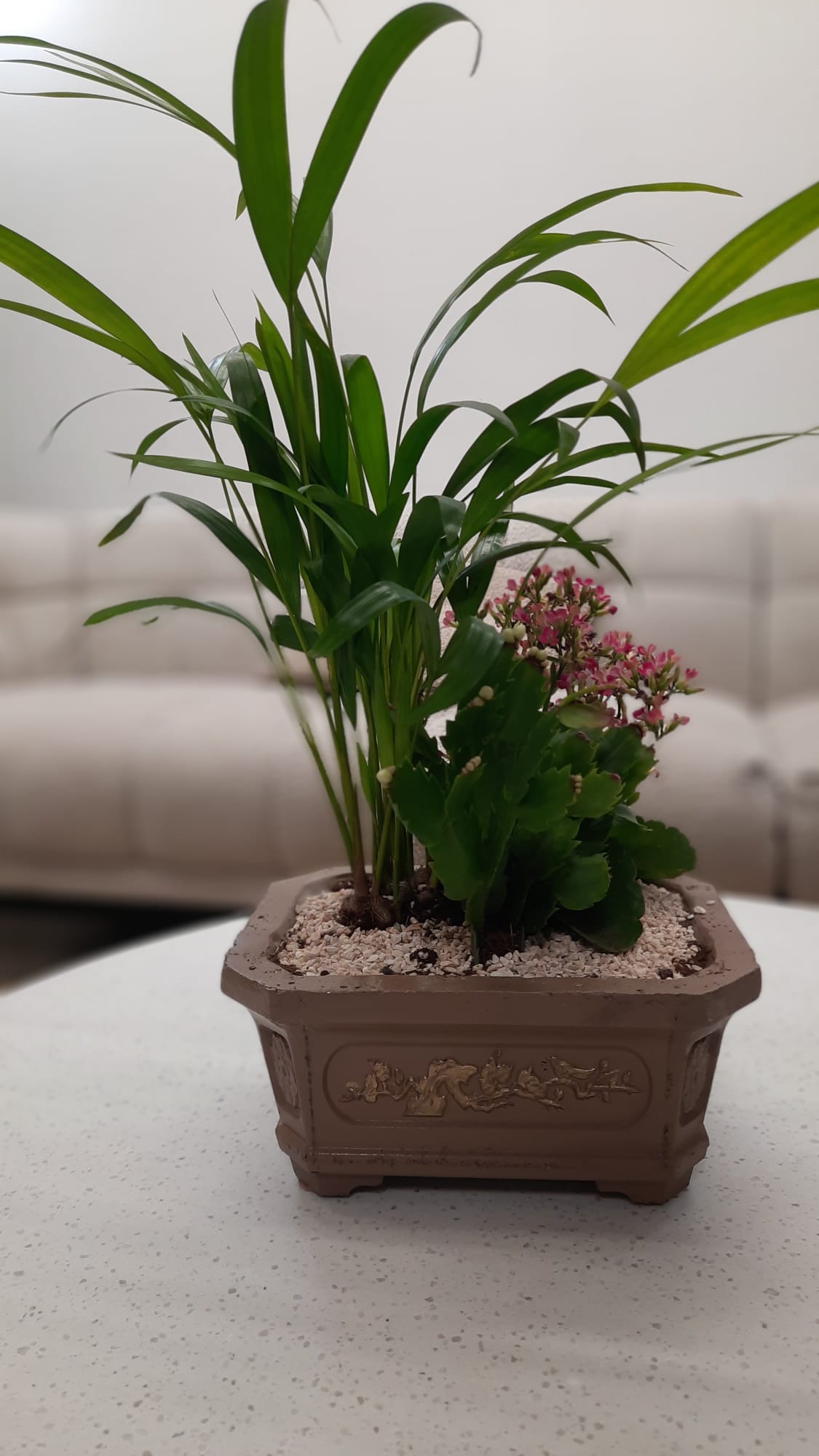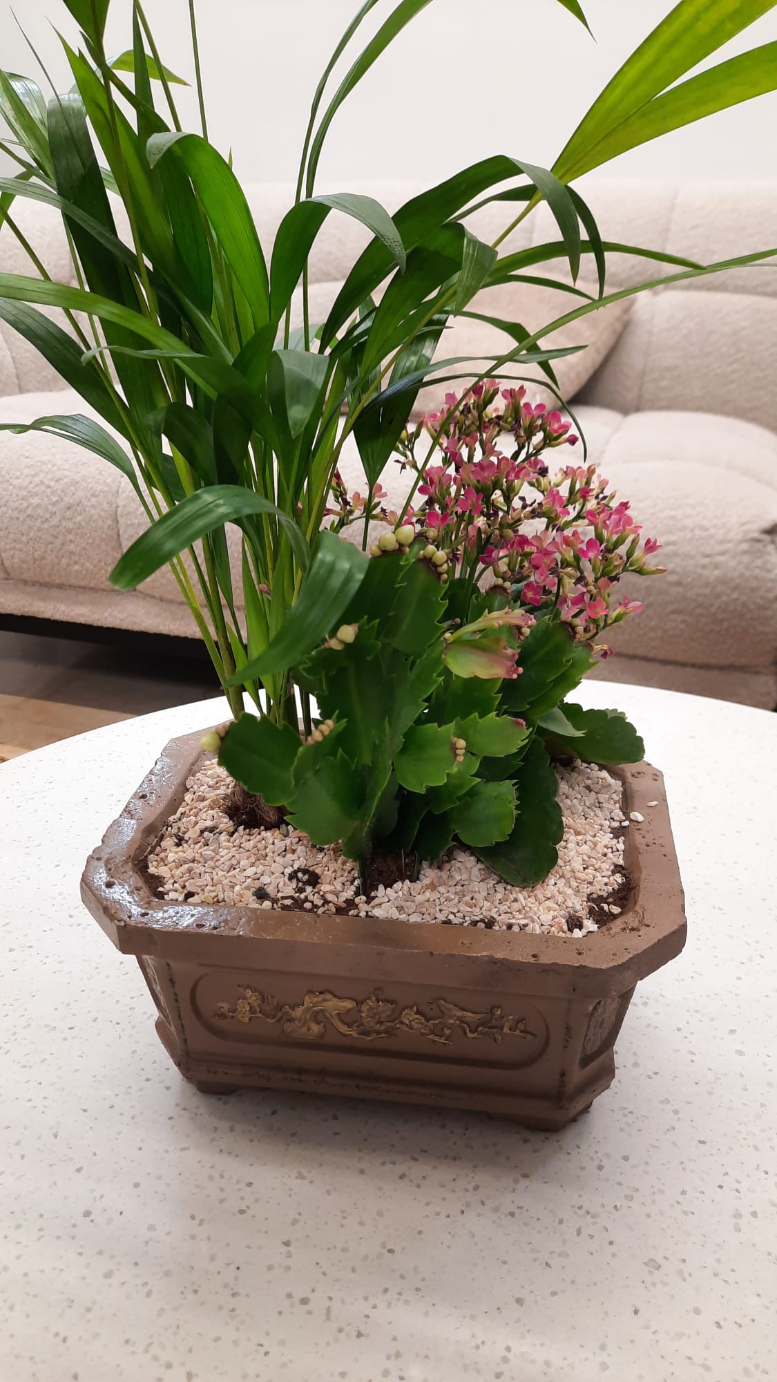 עציץ בעבודת יד בגודל 20×15 ס"מ, עשוי בטון איכותי ומקושט בסגנון יפני מינימליסטי. העציץ כולל דקלים ננסיים וצמחים מובחרים בעיצוב בונסאי, ליצירת פינה של שלווה והרמוניה בבית או במשרד. הסגנון היפני מעניק מראה טבעי ומאוזן, המשרה רוגע ותחושת מדיטציה.